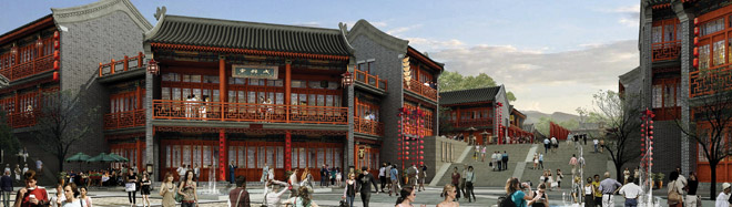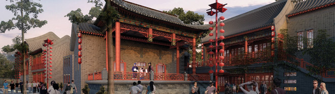 东方情景宅院与现代商业氛围的完美交融,使人们在购物休闲之余得到情感的归属。街、巷、院空间将人们从建筑中释放到室外的场所,是传统休闲环境的回归,也是新东方精神的回归。城市中的山水园林,仁者乐山、智者乐水,让繁忙的人民体验到向自然释怀。